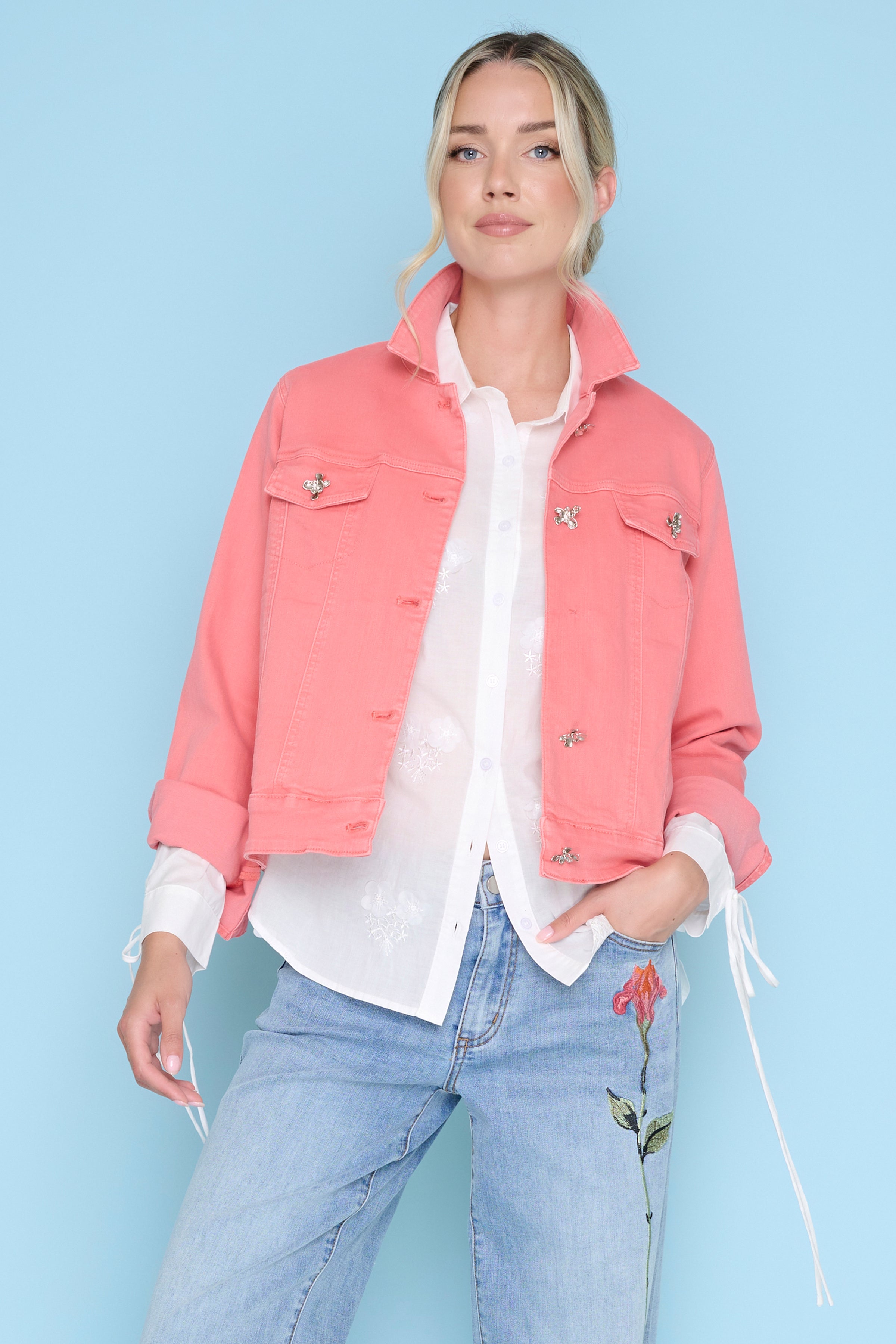 Don’t miss out and style this Flower Button Denim Jacket with a matching pair of Cuffed Cropped Jeans and a simple top underneath.