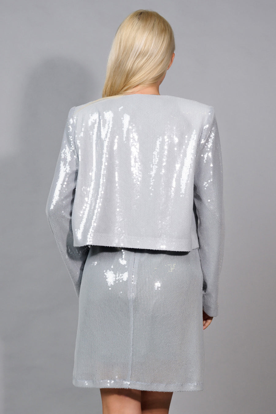 We will wear this Sleeveless Sequined Dress with our brand-new Sequined Bolero and a pair of glossy flats.