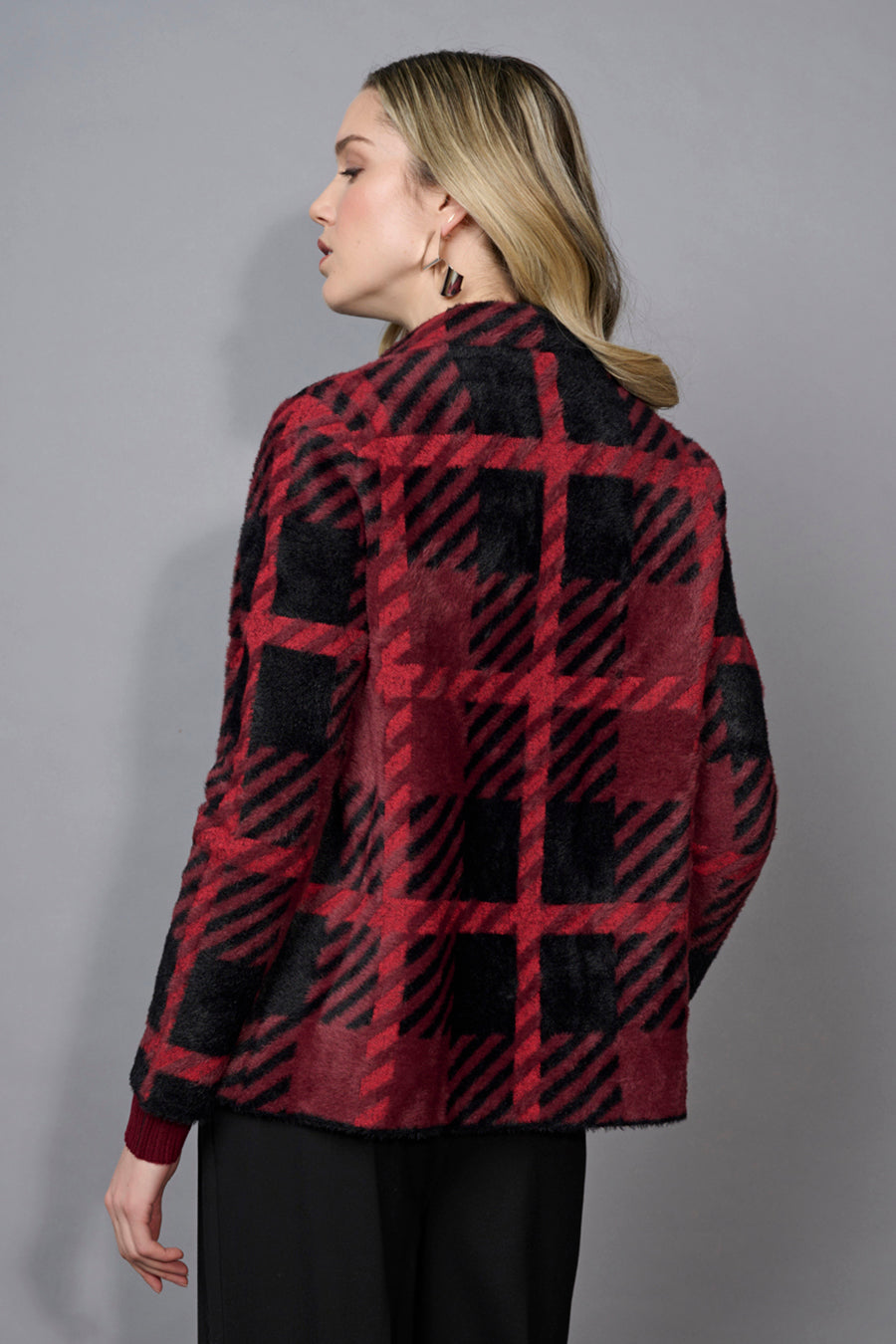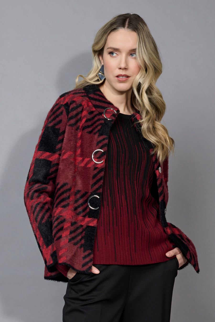 We will wear this Short Plaid Jacket with our brand-new Textured Linear Top and a pair of tailored pants.