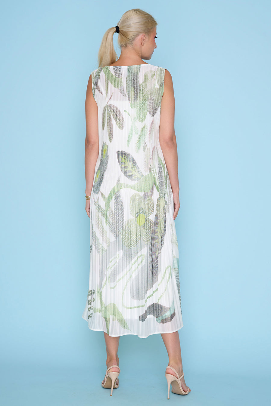 The Sleeveless Pleated Long Dress flows effortlessly in a graceful leafy print. Its pleated construction creates movement with every step, offering an elongated silhouette that feels both striking and easy to wear.