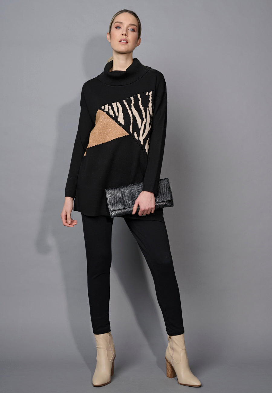 Step out in comfort and confidence with the Animal Jacquard Tunic. The rich texture, color-blocking design, and subtle animal pattern bring an elegant edge, while the longer silhouette pairs beautifully with leggings or slim pants.
