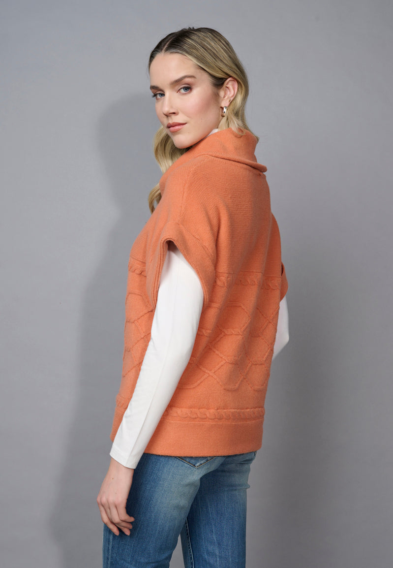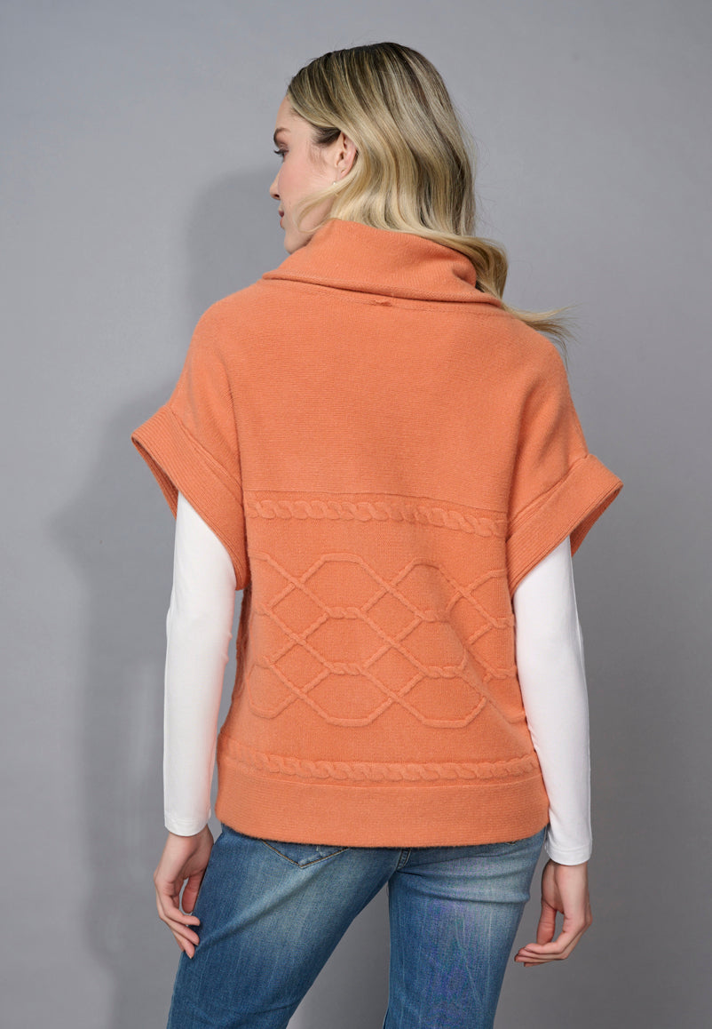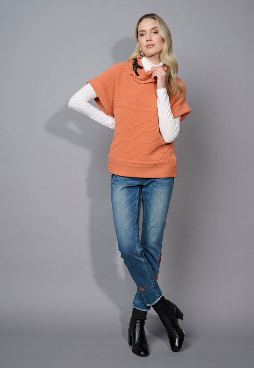 Modern texture meets cozy detail in the Cable Pattern Top With Pleather Toggle. A fresh take on a classic cable-knit look, this short-sleeve piece features a pleated toggle neckline that creates shape and interest. Pair it with trousers or slim jeans for a fashion-forward finish.