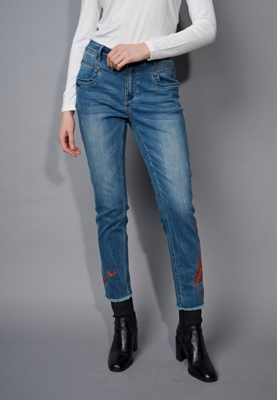 Designed to dazzle, the Flower Embellished Ankle-Length Jeans bring whimsy to your wardrobe. Textured floral details bloom across a classic denim base, making these the perfect blend of playful and practical. Pair with cozy knits or a clean white blouse to keep them in focus.