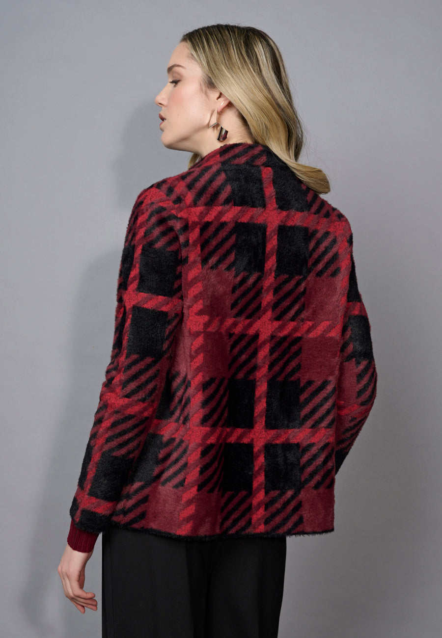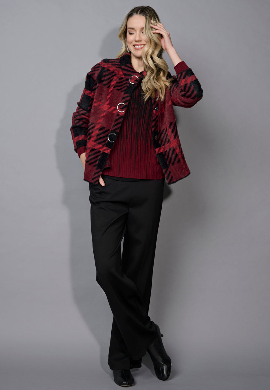 We will wear this Short Plaid Jacket with our brand-new Textured Linear Top and a pair of tailored pants.
