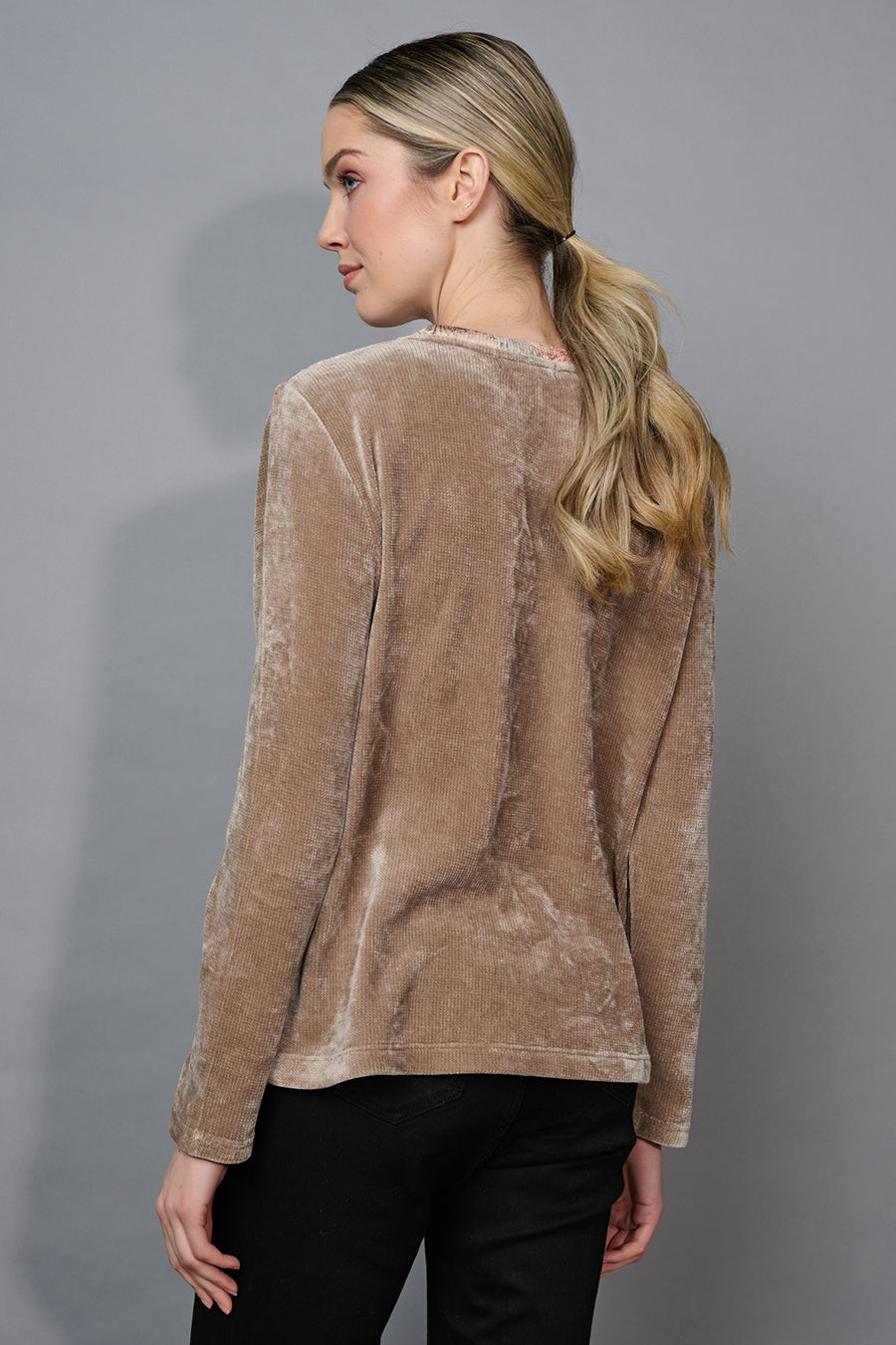 Features of the Solid Velvet Crew Neck Printed Knit Top: