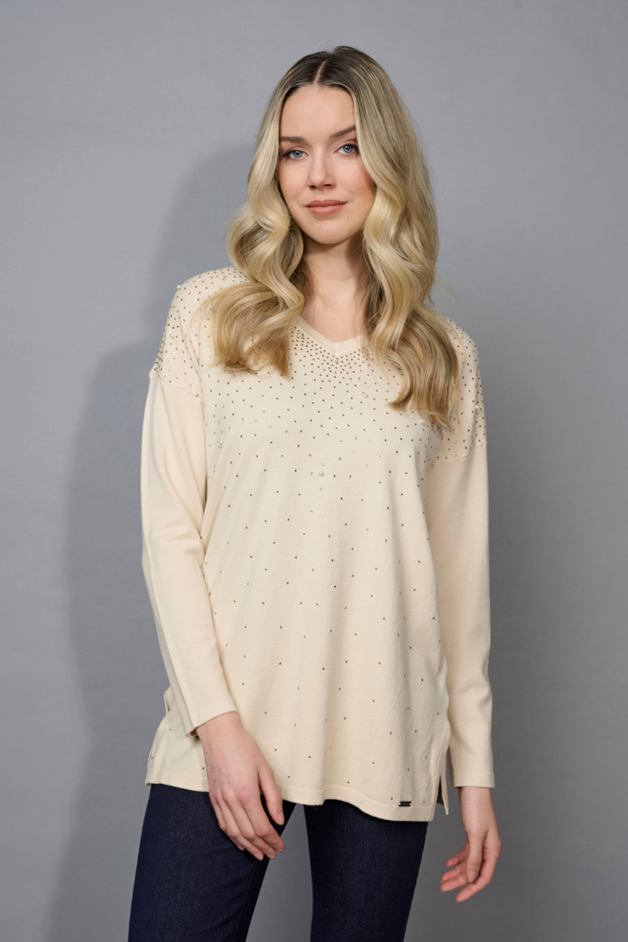 Style this Embellished V-Neck Top with a pair of leather leggings and knee-high boots for a show-stopping look!