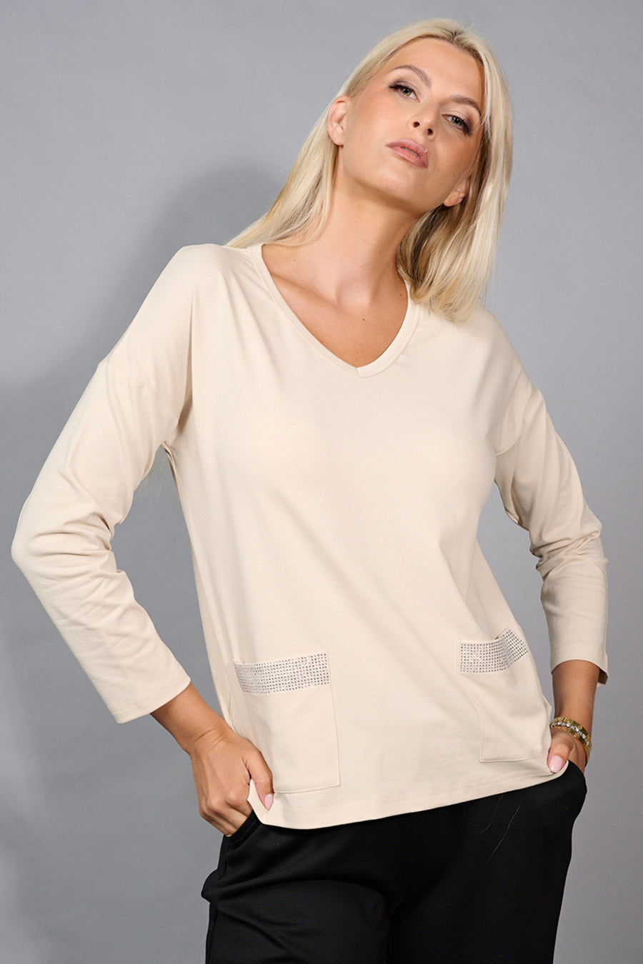 Relaxed with a touch of structure, the V-Neck Top With Pockets is a perfect everyday go-to. Two front patch pockets add casual flair, while the flattering neckline and easy fit make it ideal for layering under jackets or worn over turtlenecks.