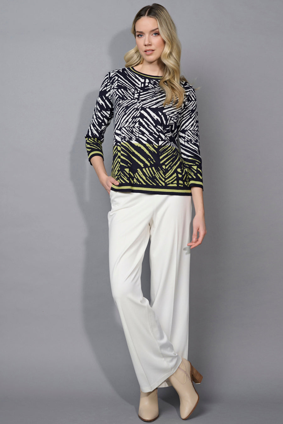 Style this 3/4 Sleeve Abstract Printed Top with a pair of Pull-On Straight Leg Pants in Off-White color – a casual yet stylish look that will never disappoint!