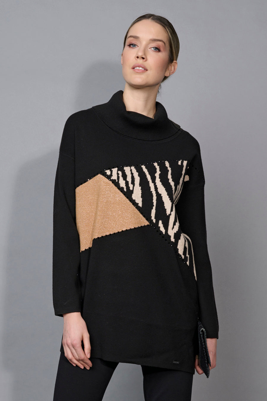 Step out in comfort and confidence with the Animal Jacquard Tunic. The rich texture, color-blocking design, and subtle animal pattern bring an elegant edge, while the longer silhouette pairs beautifully with leggings or slim pants.