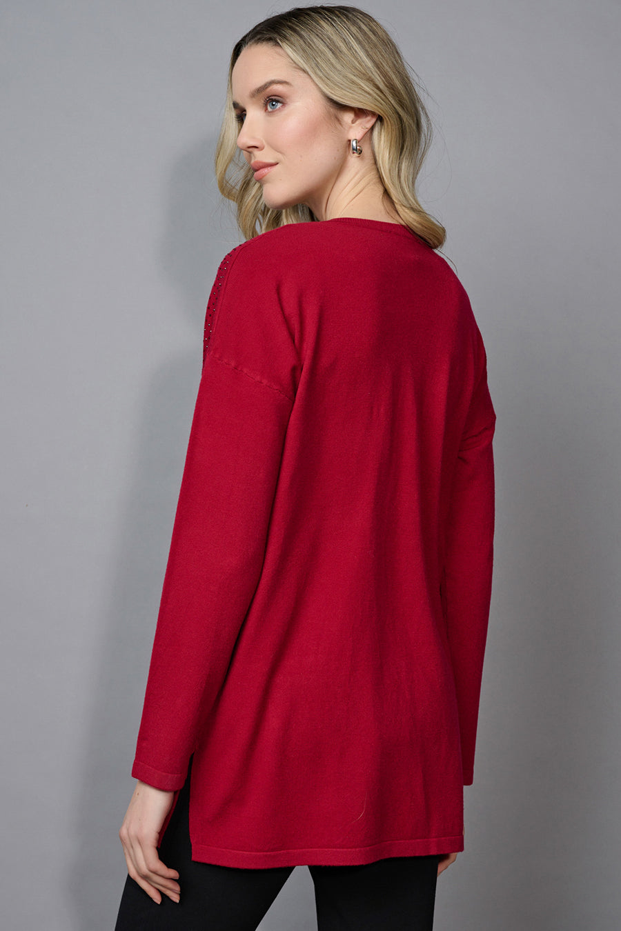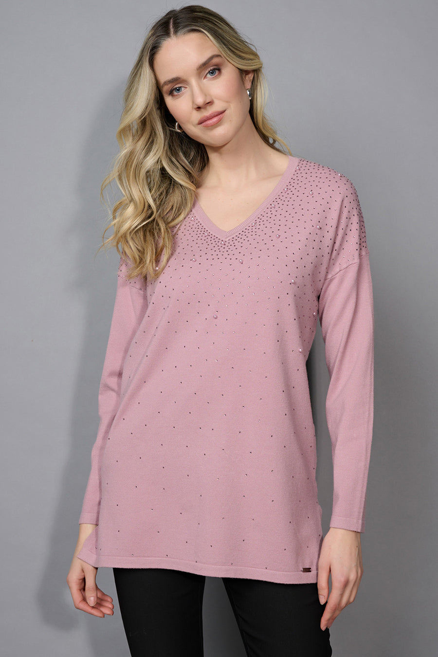 Style this Embellished V-Neck Top with a pair of leather leggings and knee-high boots for a show-stopping look!