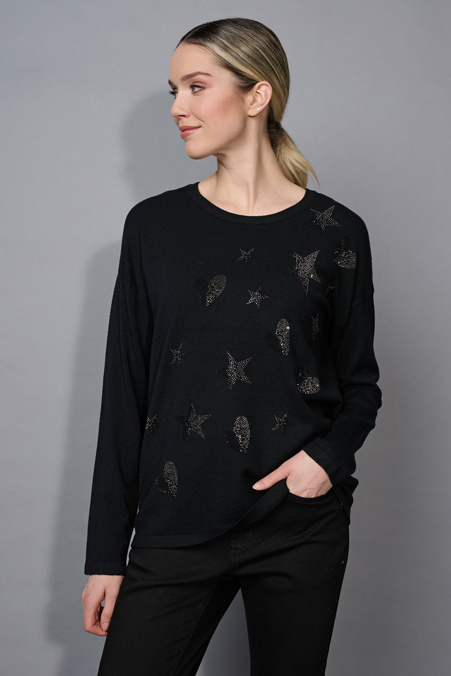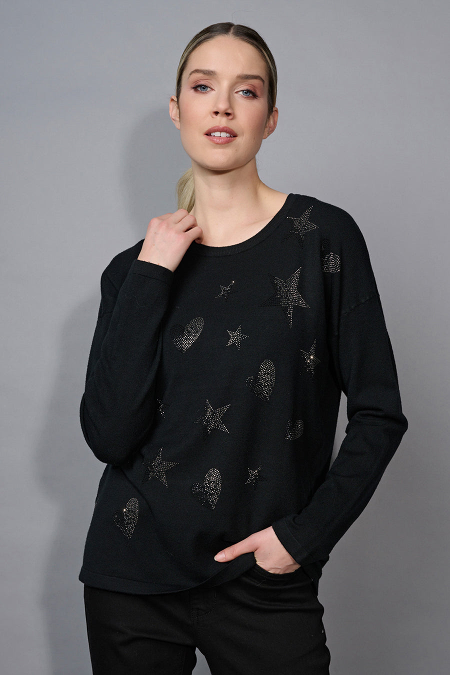 Whimsical and radiant, this Star Heart Rhinestone Top pairs playful star and heart motifs with sparkling rhinestone embellishments. The result is a top that brings personality and shine to your cold-weather wardrobe. Dress it up with a sleek pair of leather leggings for a day-to-night look.