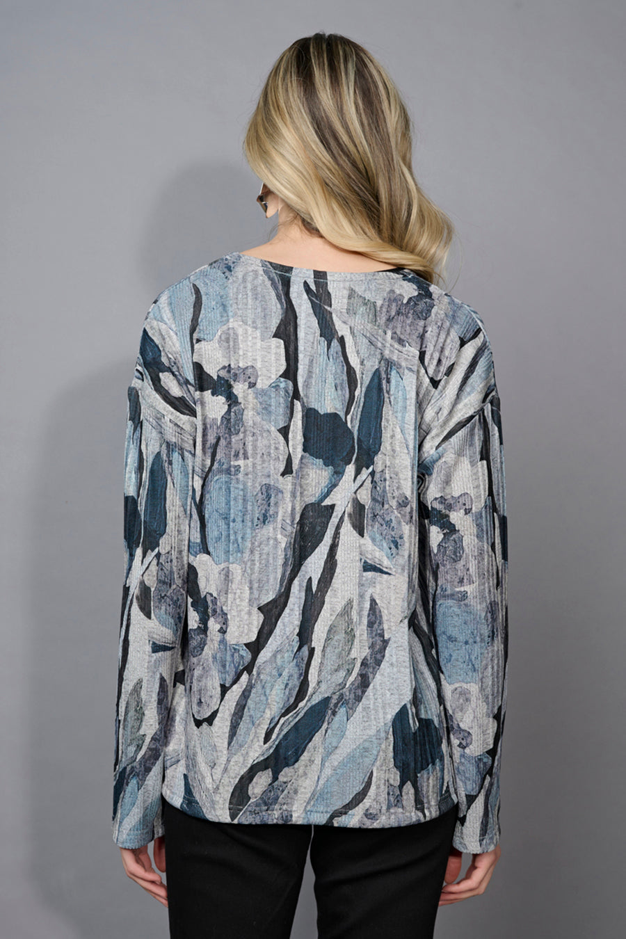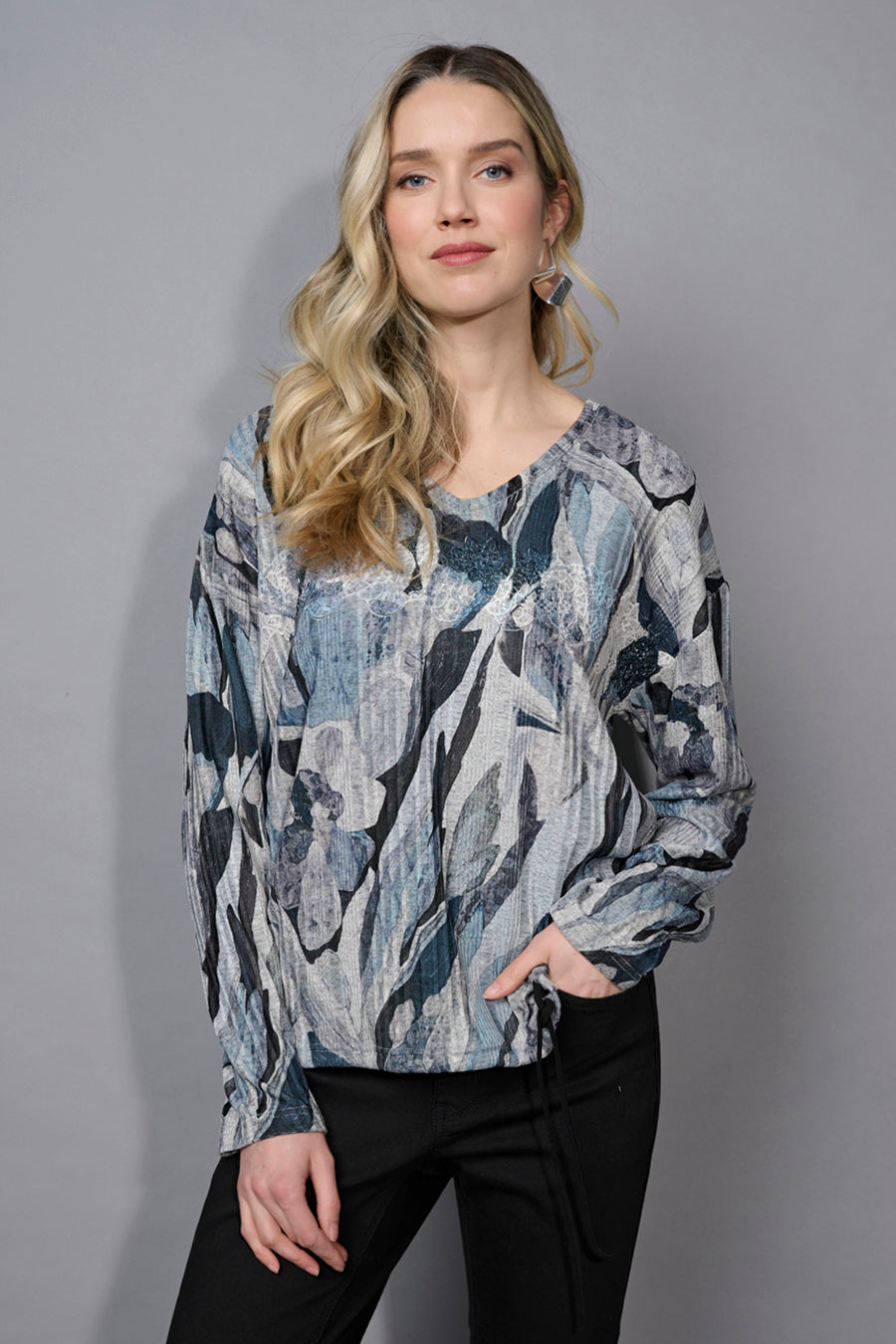 The V-Neck Drawstring-Hem Embroidered Printed Top features an abstract seasonal print in saturated tones, paired with a drawstring hem for adjustable shape and comfort. The relaxed V-neckline completes its polished yet casual feel.