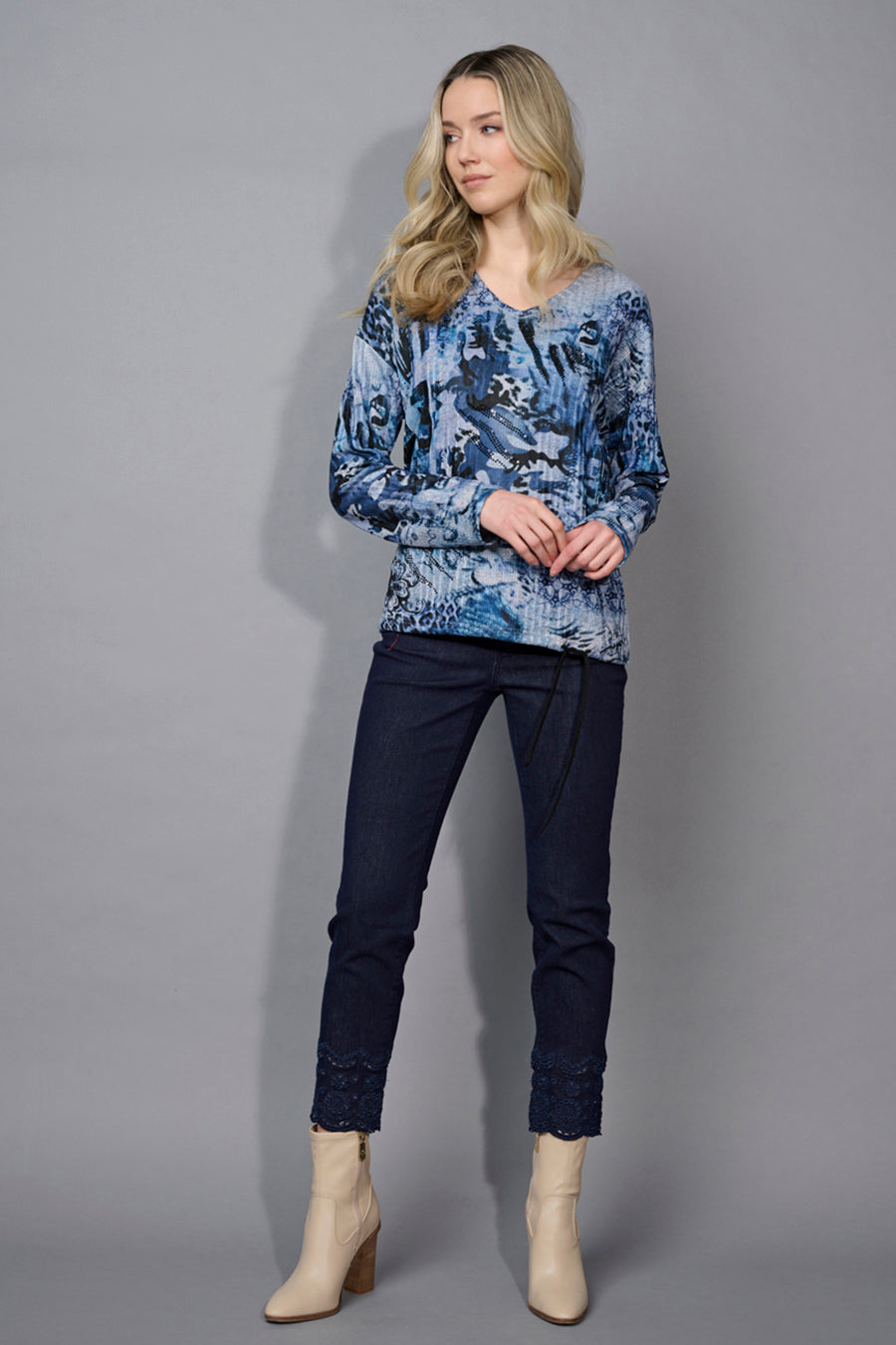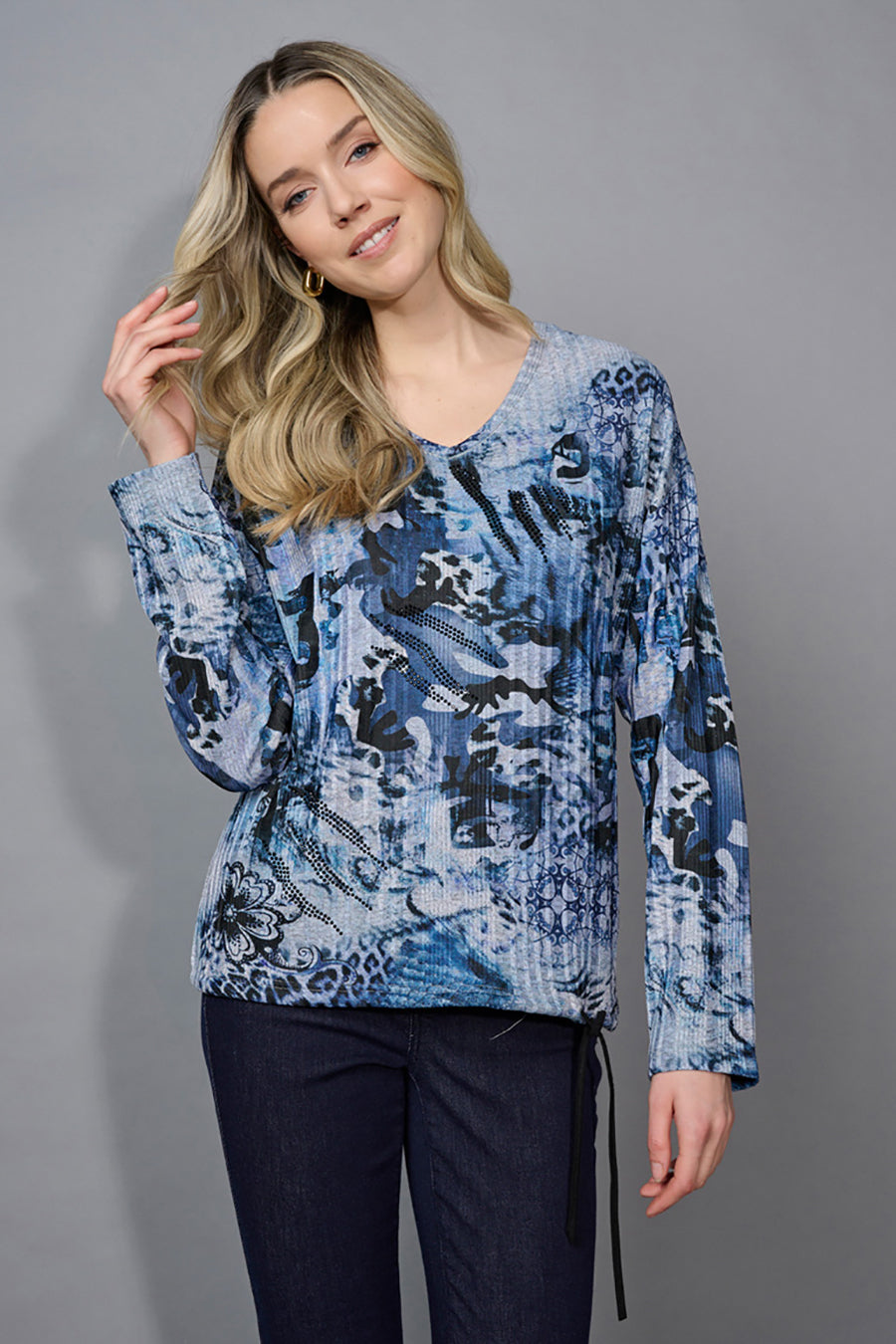 Style this V-Neck Drawstring Hem Printed Top with a pair of cropped jeans – a dressy day-to-night look is ready!