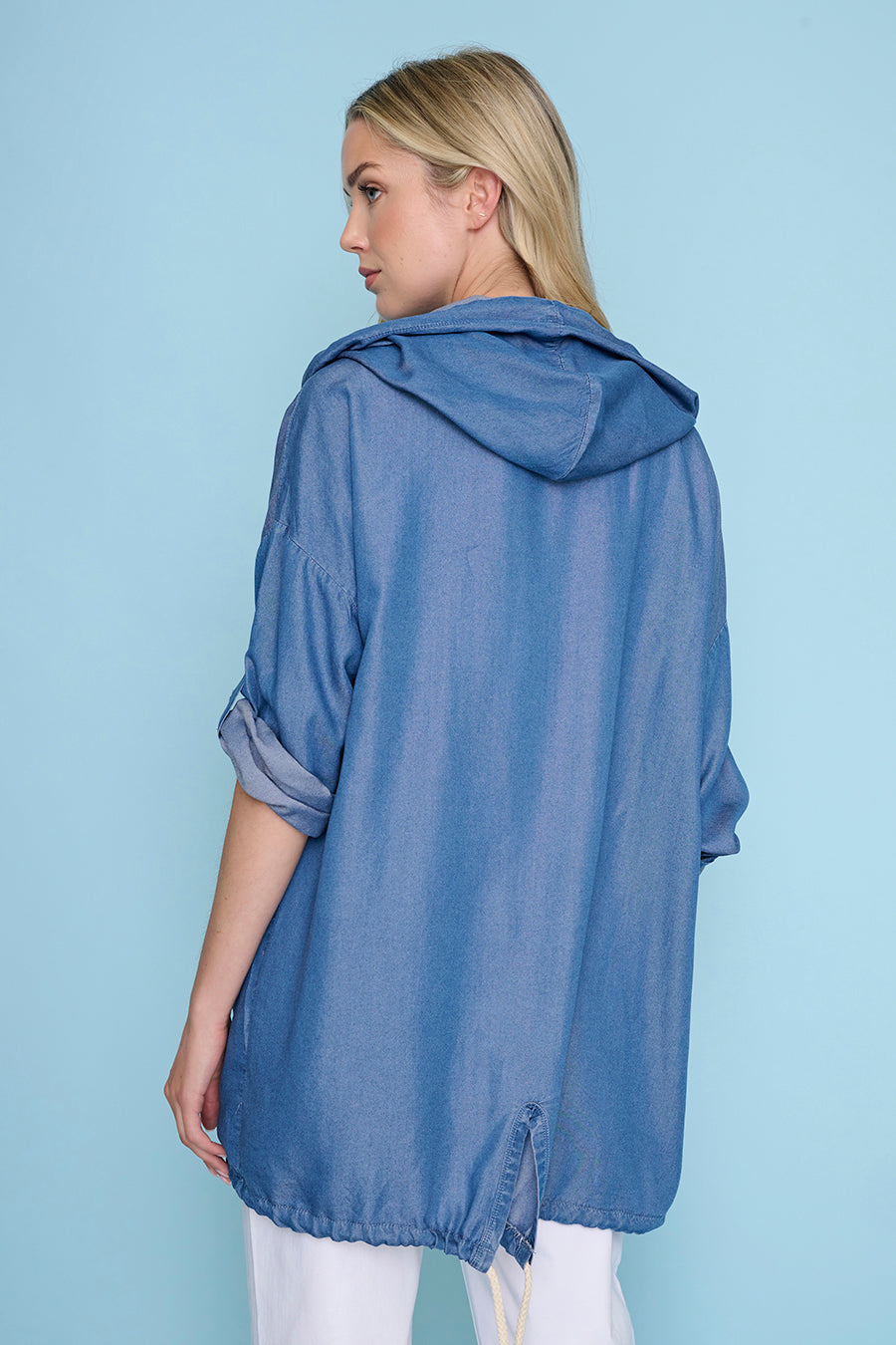 We will wear this Hooded Open-Front Long Jacket over a total-white outfit to highlight all the beauty of the denim hue.