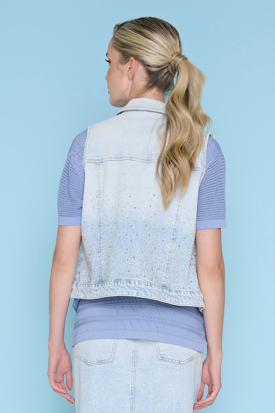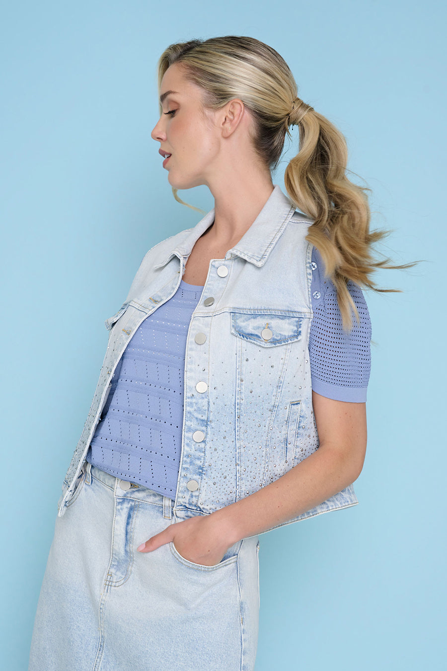 The Rhinestone Denim Vest brings shine to classic denim in a clean, streamlined shape. Easy to layer over tops and dresses, this vest is a standout piece that elevates casual outfits, adding sparkle to your everyday outings.