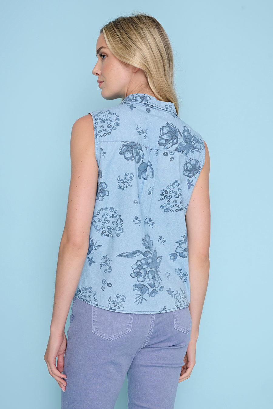 Trending print and relaxed fit, the Tie-Front Tank delivers both! This spring-time sleeveless shirt features a soft drape with an adjustable front tie for a flattering fit while its collared v-neckline allows plenty of room to experiment with accessories. Crafted from breathable cotton fabric, this top’s denim hues match perfectly with washed-out denim and off-white capris - a versatile piece that pairs effortlessly with most of Spring looks.