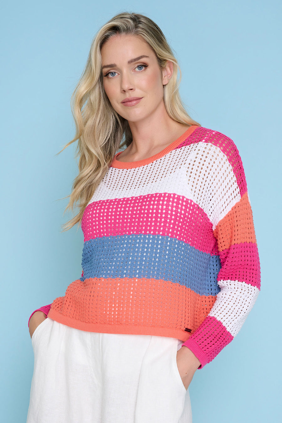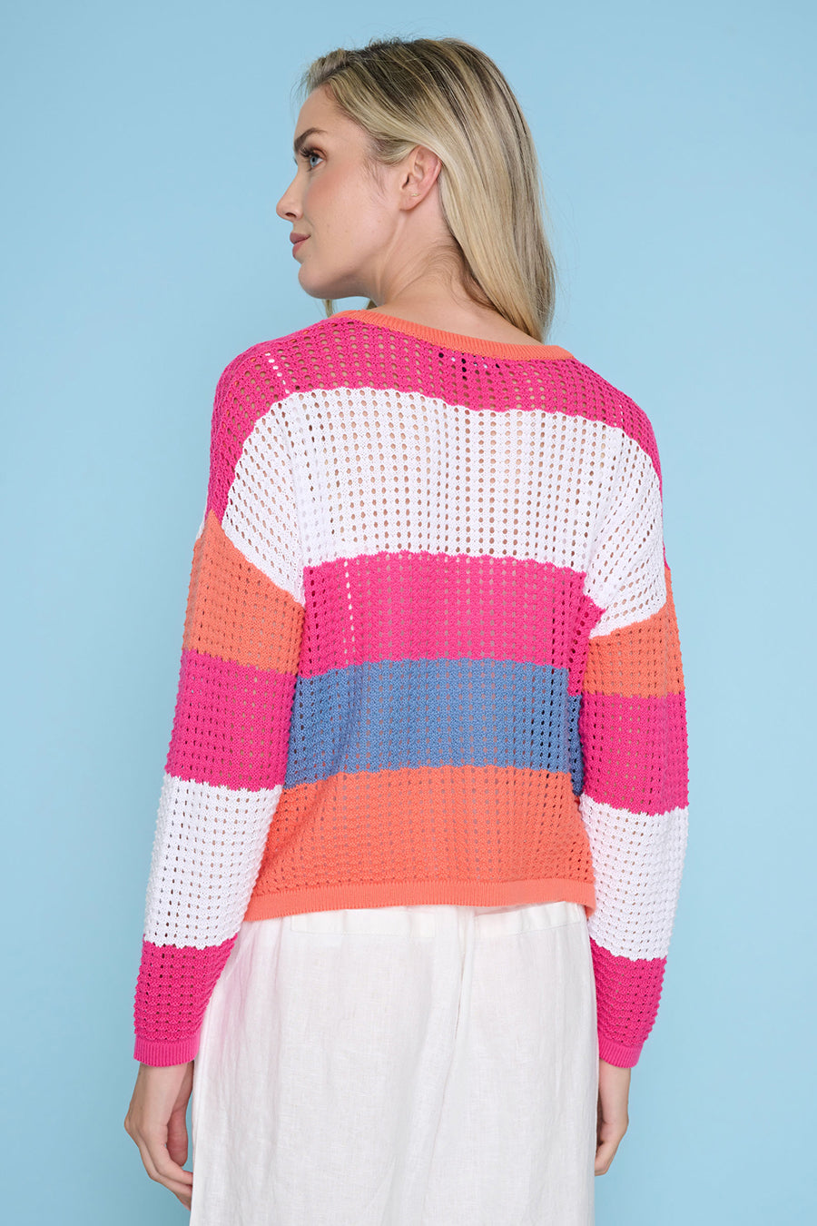 Réinterprétation d'un classique, le haut à rayures multicolores allie le confort d'un tricot doux à un motif rayé vif. Le jeu de couleurs apporte de l'énergie sans être écrasant, ce qui en fait une pièce facile à porter au quotidien, mais qui attire le regard.