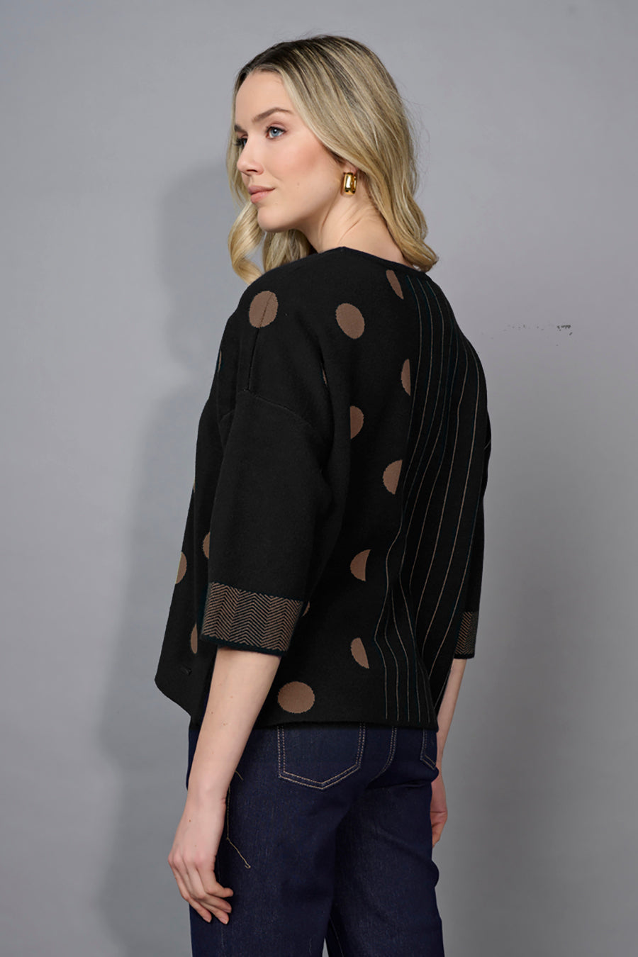 Style this 3/4 Sleeves Striped Polka-Dot Top with Wide-Leg Cropped Jeans and a pair of botos for a comfy weekend look.